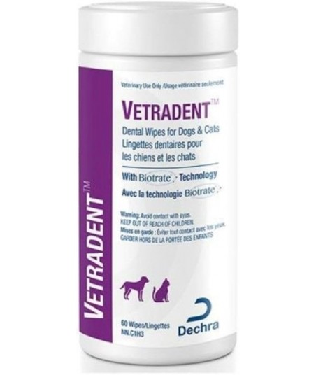Toallitas humedas para ayuda en la higiene dental. Contiene Citrato de sodio, ácido cítrico y cloruro de zinc.Los ingredientes se unen al hierro, calcio y magnesio de la placa y el sarro favoreciendo su remoción. Para uso en caninos y felinos